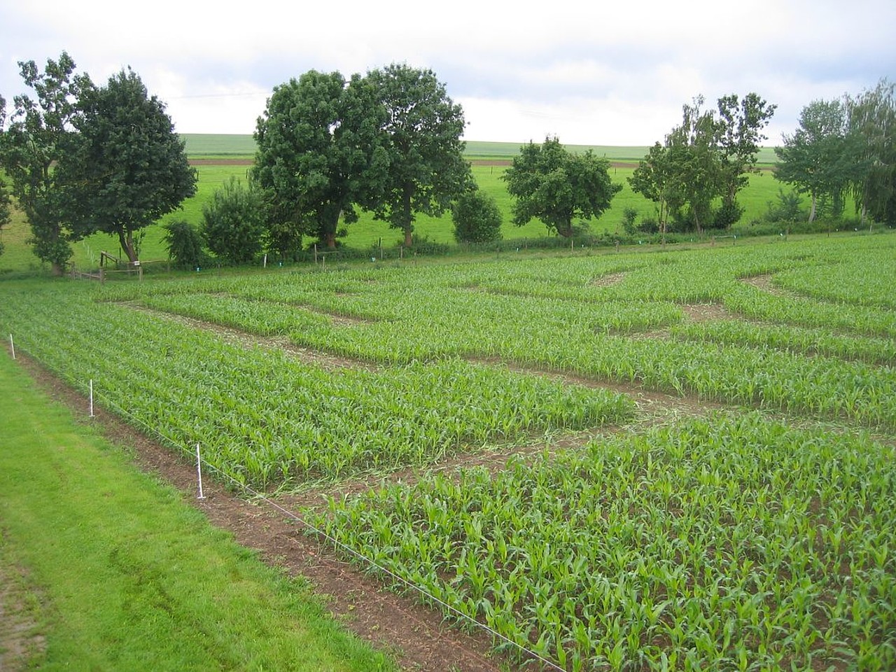 Dem Ihinger Hof wurde im Jahr 2008 die Auszeichnung "Land der Ideen" verliehen. Um dies zu feiern wurde ein großer Kindererlebnistag veranstaltet. Auch ein Maislabyrinth zählte zu den zahlreichen Attraktionen. Auf einem Papierblatt wurde ein Labyrinth gezeichnet, diese digitalisiert und georeferenziert. Anschließend wurden die Wege des Labyrinthes vom GIS am Büro-PC auf den tragbaren Feldcomputer geladen und die Wege mit einer Kalkspur im etablierten Maisfeld nachgezogen. Durch mehrmaliges Mähen mit dem Rasenmäher wurden die Wege frei gehalten. Somit entstand dank GPS-Technik in kurzer Zeit ein schönes Maislabyrinth...